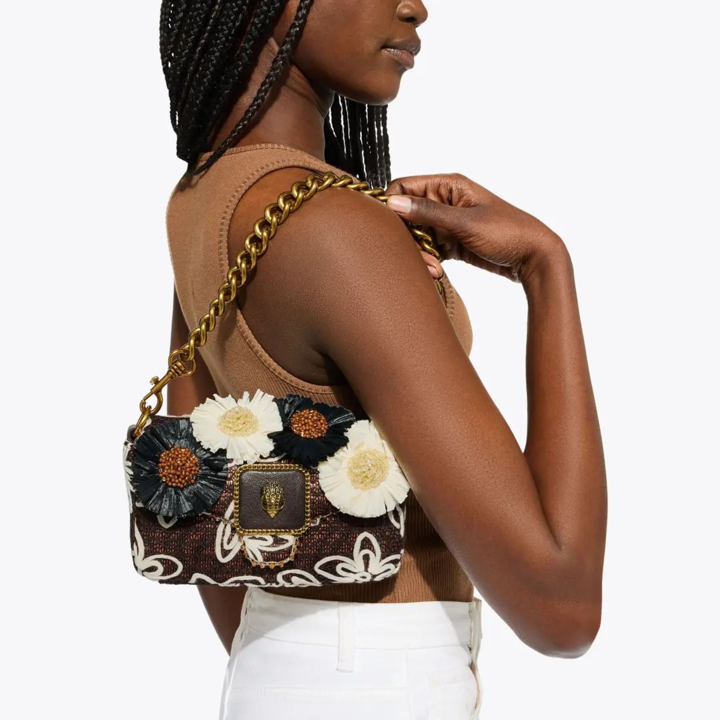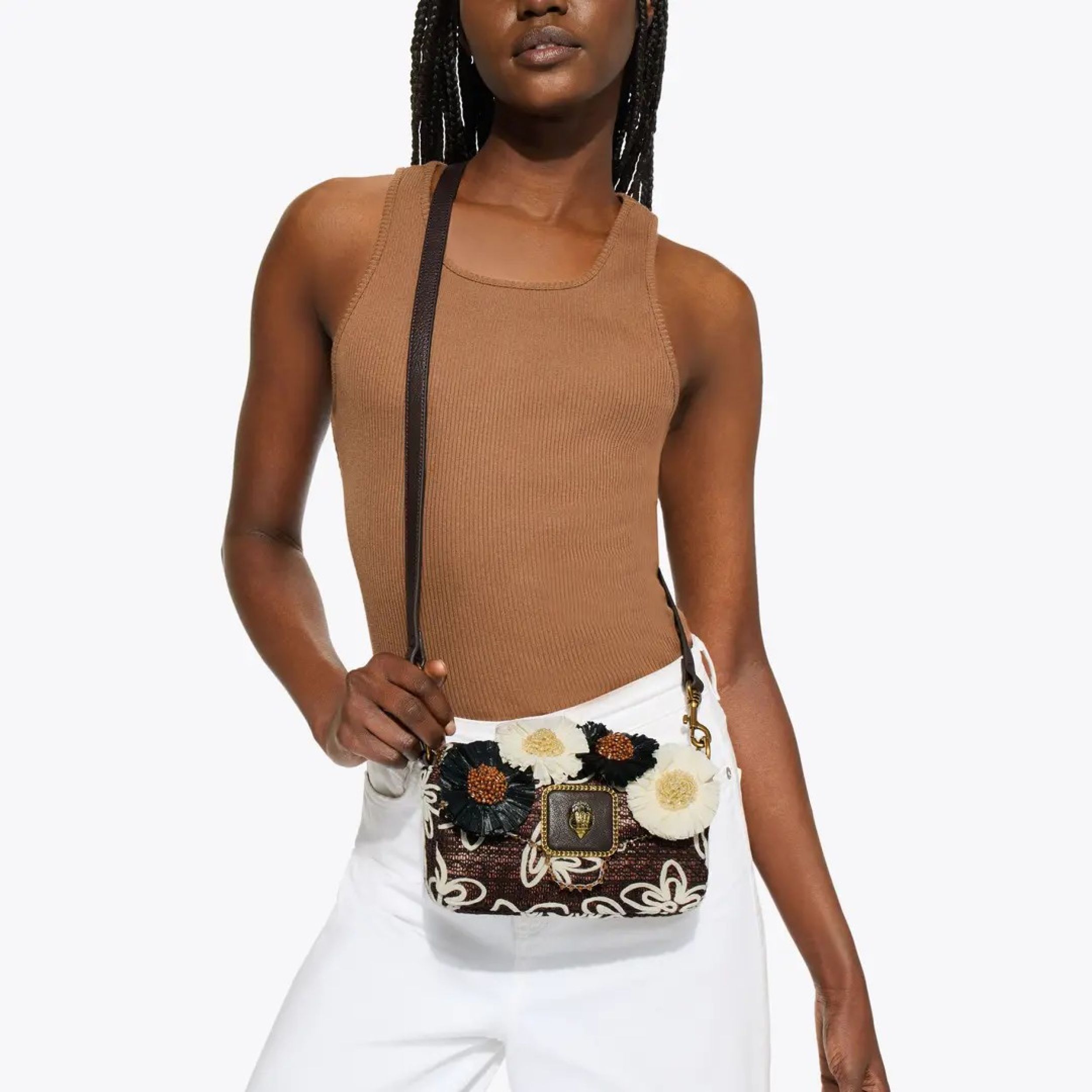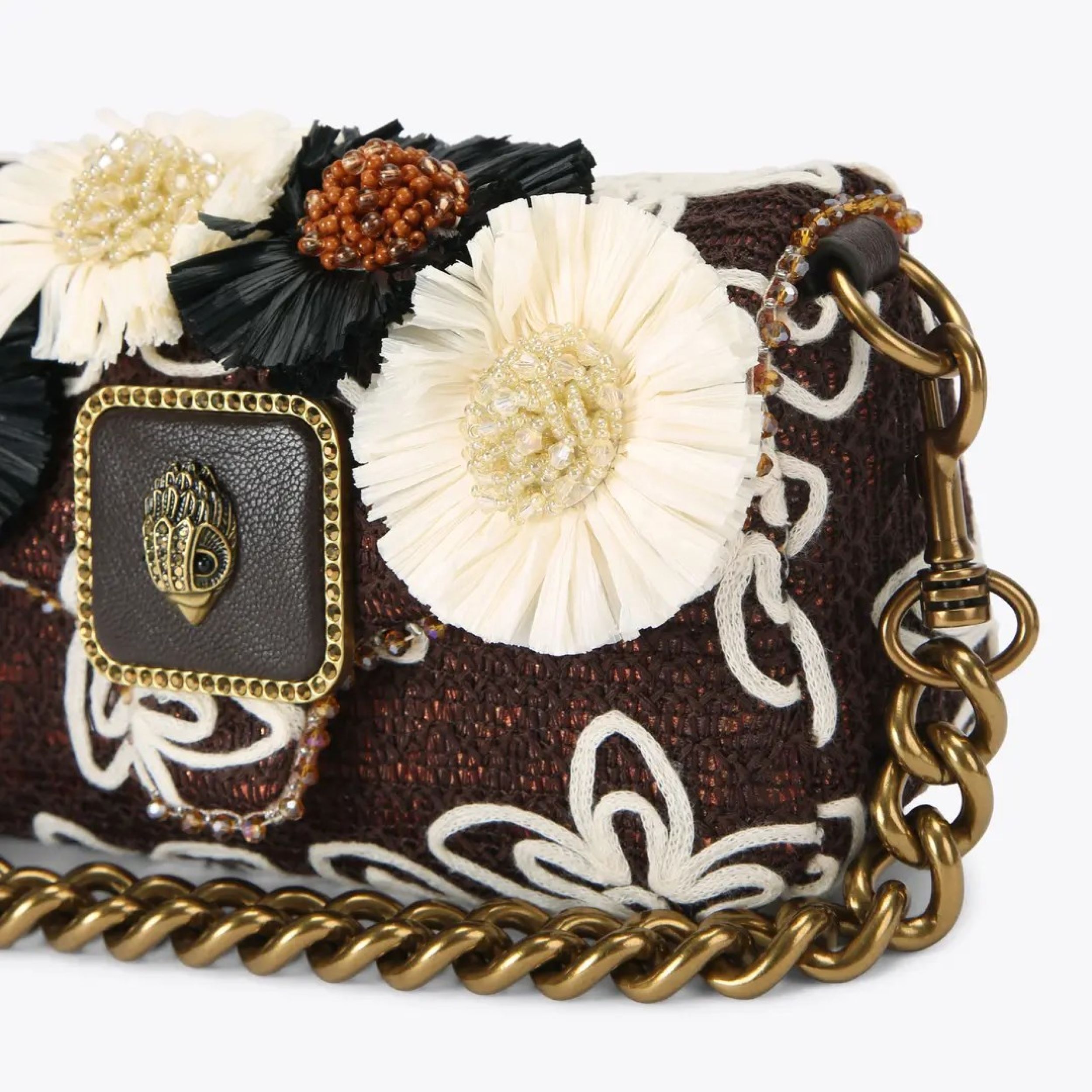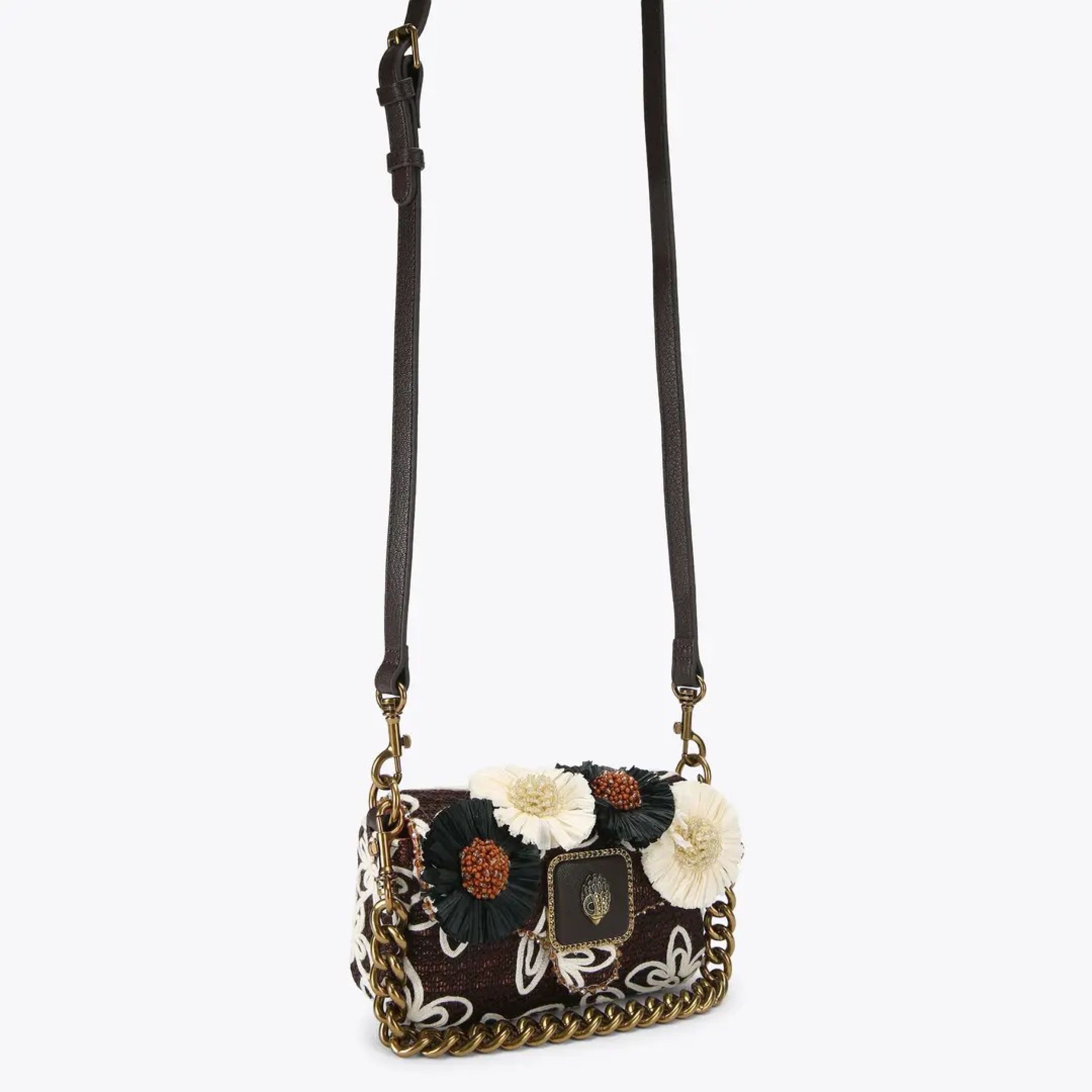 € 229This Mini Pimlico Bag arrives in a black fabric with bone floral embroidery. There are also 3D raffia flowers across the front of the bag as well as an antiqued brass eagle head on the front flap. 12cm (H), 21cm (L), 6cm (D) Strap length: 135cm Antiqued brass shoulder strap Optional brown cross body strap Flat open pocket on the back Interior zipped pocket Can fit phones up to 6inches Material: Fabric
