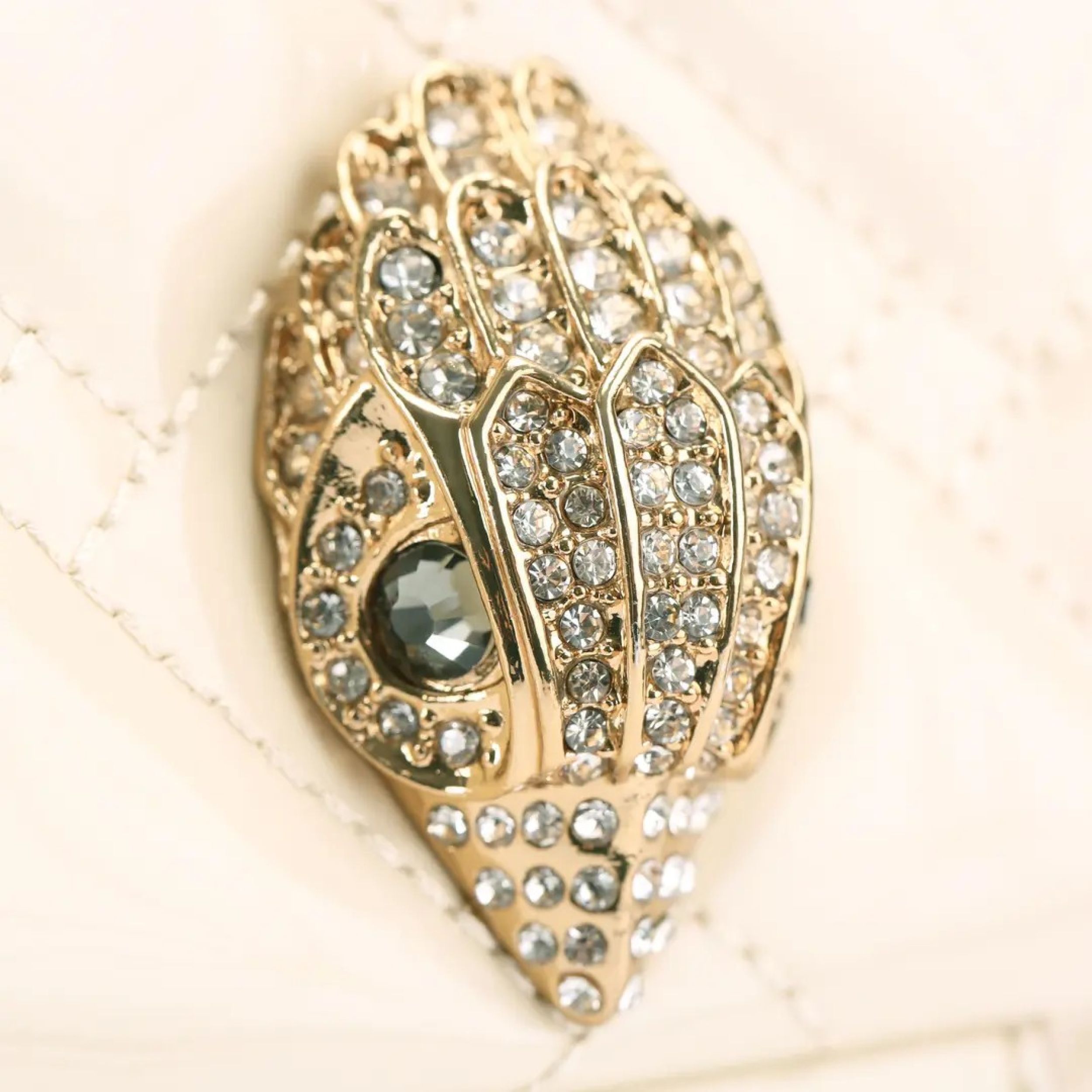 € 298The Leather Kensington bag is crafted from a cream patent leather with overstitch quilting design. The gold eagle head features crystals and black bead eyes on the front flap. 17cm (H), 26cm (L), 8cm (D) Strap drop cross body: 111cm Gold chain strap with two padded inserts Duo magnetic snap closure hidden under flap Gold branded plate on the back Two interior compartments with small internal lining pocket Material: Leather Style number: 5021542309