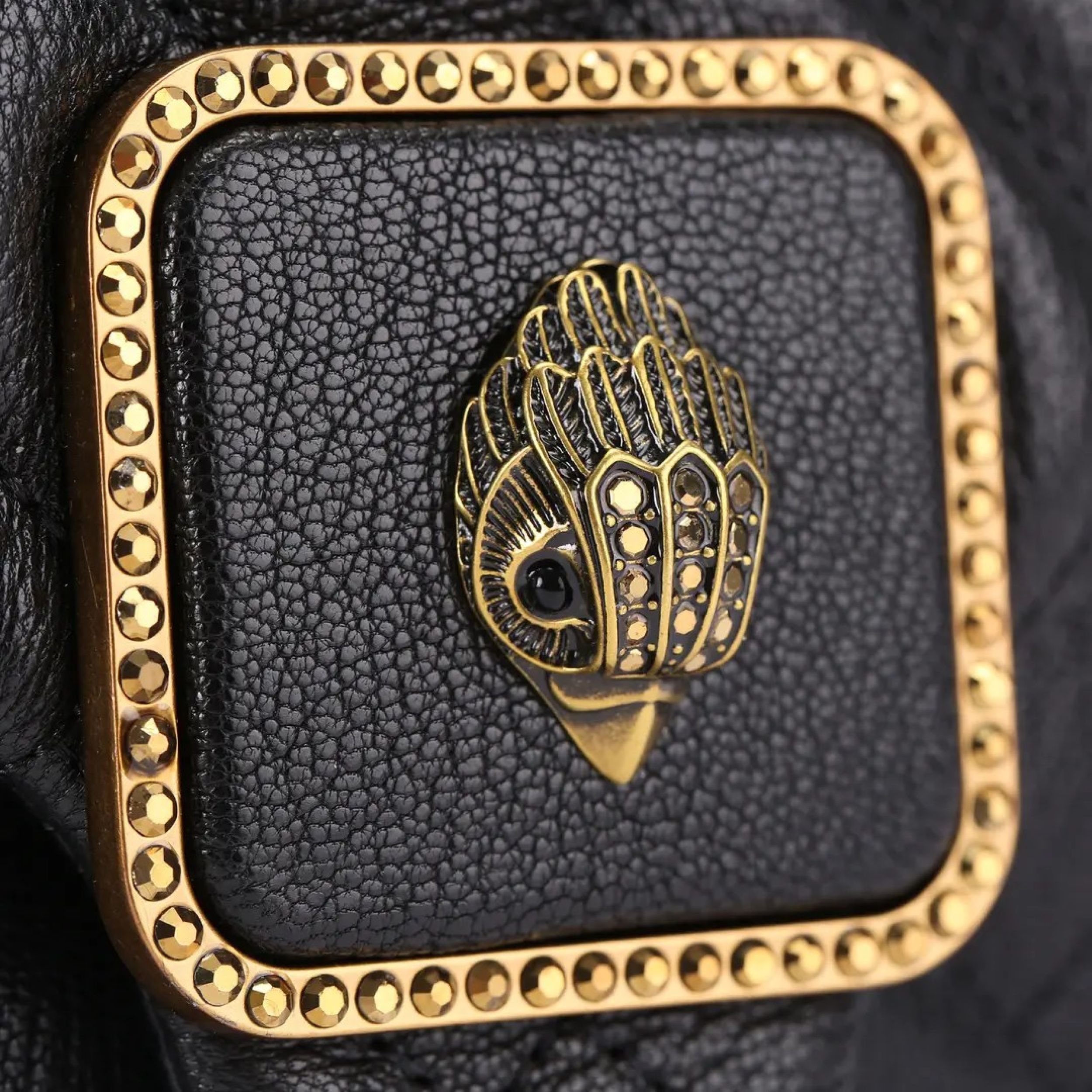 € 298This Pimlico Purse is crafted from a soft black grained leather with overstitch quilting detail. There is a large black leather plate with antiqued brass crystal trim and eagle head on the closure. 5.5in (H), 10.2in (L), 3.1in (D) Strap length: 25.9in Antiqued brass shoulder strap with leather padded inserts Flat open pocket on the back Antiqued brass branded plate on the back Can fit phones up to 6inches Material: Leather Style number: 5374900109
